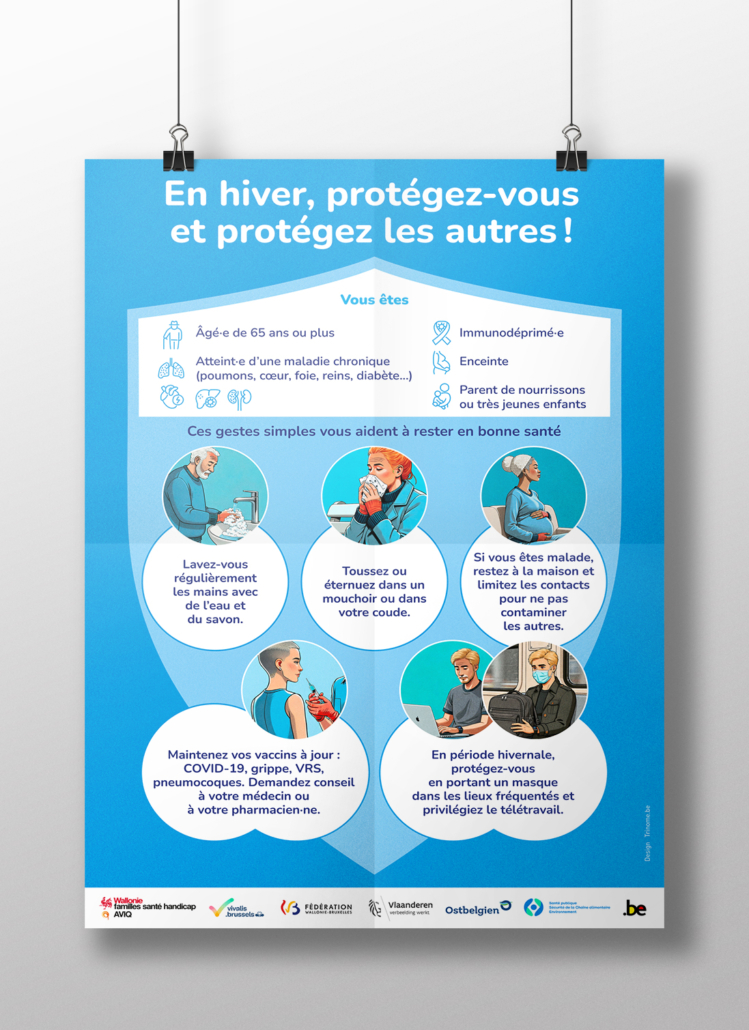 Lorsque l’hiver pointe son nez, c’est la Belgique qui s’enrhume ! Mais les infections respiratoires peuvent faire boule de neige. Pour ne pas en arriver là, cette année le SPF Santé publique s’est adressé à Trinôme. Nous leur avons concocté des infographies claires et attractives, ainsi que des affiches dédiées aux publics les plus à risques. Un travail intéressant et surtout bien utile !